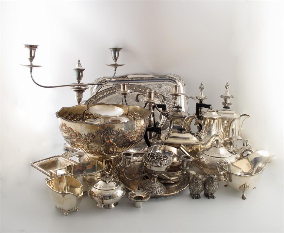 A large collection of electroplated items, comprising tea sets, trays, candelabra, and other items including a pair of old Sheffield plated candlesticks. (qty)