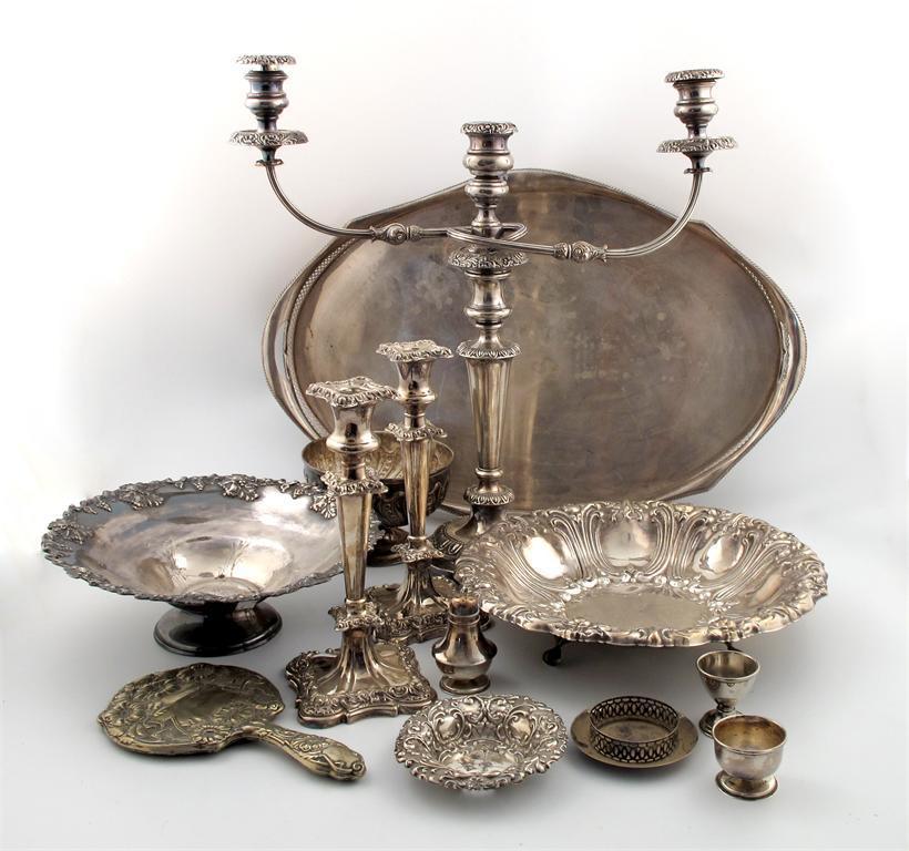 comprising: a three-light candelabrum, tapering circular form, reeded scroll branches, foliate borders, on raised circular bases, and an oval gallery tray, plus two dishes, a rose bowl, a bonbon dish, a pair of candlesticks, and five small items. (qty)