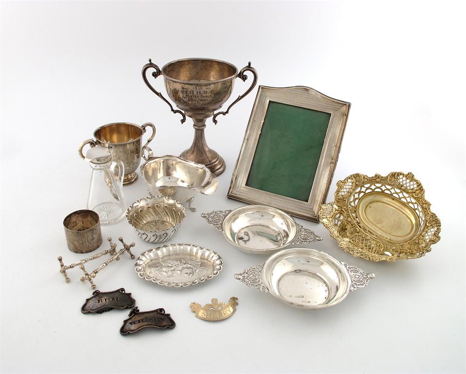 comprising: two trophy cups, a pair of silver-gilt bonbon dishes, another pair of bon bon dishes, a sauce boat, a photograph frame, a bowl, a pin dish, a whisky tot, a pair of knife rests, a modern wine label, a napkin ring and two unmarked wine labels, approx. weighable 20oz. (qty)