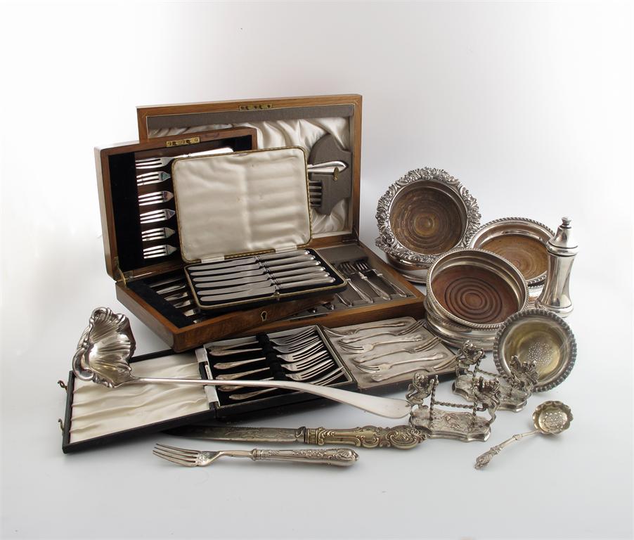 comprising: silver items: an American silver pepper mill, by Tiffany and Co, plain tapering circular form, on a circular foot, height 16.5cm, plus electroplated items: a pair of knife rests, three pairs of wine coasters, a punch ladle, cased sets of fruit eaters and other items. (qty)