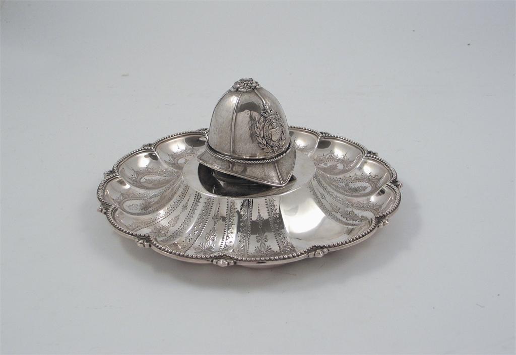 A Regimental Interest: A Victorian ink well, of lobed circular outline, with a bead border and engraved well, centred by a pith helmet with the badge of the West Sussex Yeomanry, hinging open to reveal a glass ink bottle, by W and J Barnard, London, 1879, 7.5in (19cm) diameter, 9oz weighable.