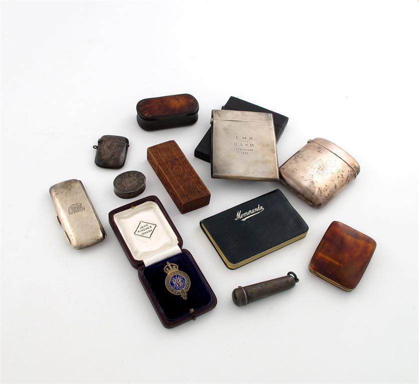 comprising silver items, a cigarette case, the hinged side opens to reveal a photograph frame, a card case, a thin cigarette case, a vesta case, a pill box, a cigarette holder and case, plus a cased badge of Royal Agricultural Society of England, and non silver items including a card case, snuff box, match box holder and a notebook, approx. weighable 8oz. (qty)