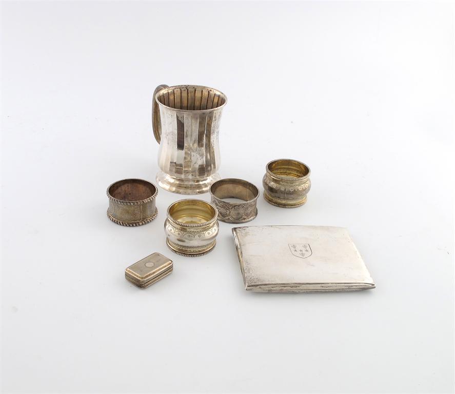 comprising: a George III silver-gilt vinaigrette, Birmingham 1813, a silver mug of panelled baluster form, two Victorian napkin rings, plus two other napkin rings and a cigarette case, approx. weight 12oz. (7)