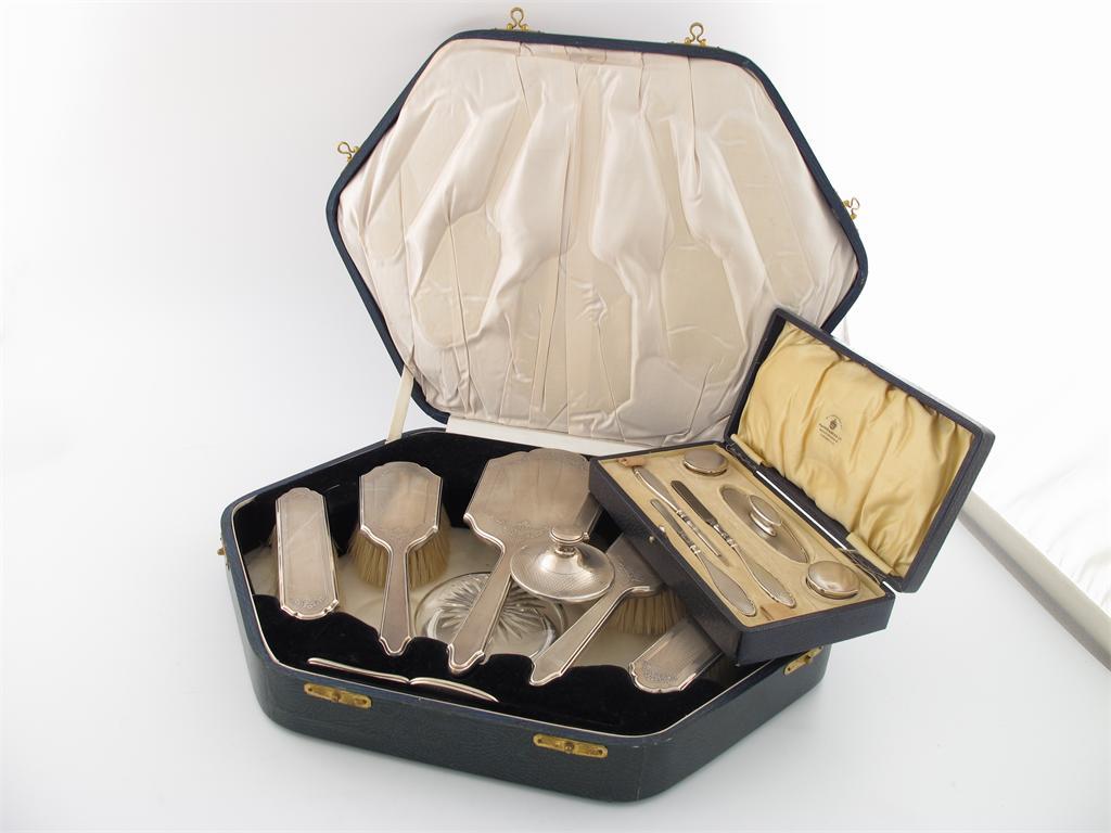A six-piece silver dressing-table set, by H. Matthews, Birmingham 1928, engine turned and foliate decoration, in a fitted case, plus a cased six piece manicure set and a silver mounted powder jar. (3)