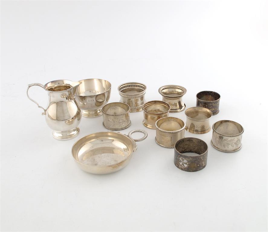 A mixed lot of silver items, various dates and makers, a modern wine taster of circular form, snake handle, a sparrow beak cream jug and sugar bowl, plus seven napkin rings, a Maltese napkin ring and a continental napkin ring, approx. weight 14oz.