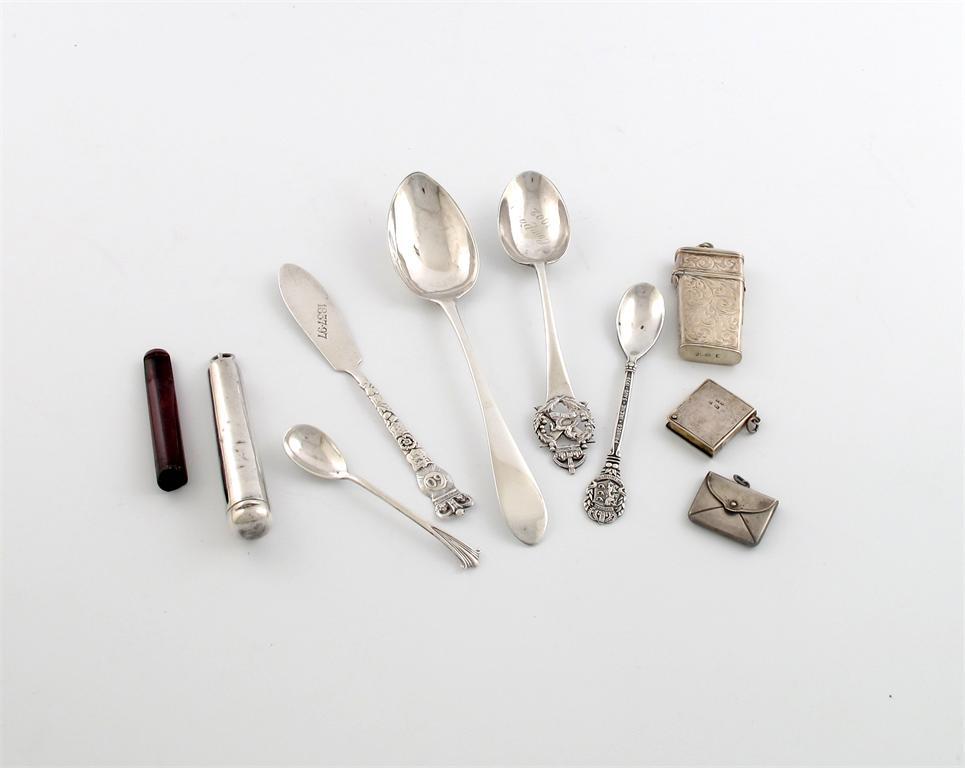 comprising: a stamp case of book form, a stamp case of letter form, a lancet case, a Scottish Celtic point dessert spoon, a Victorian Diamond Jubilee butter knife, a Regimental spoon, an amber cigarette holder in a silver case, a mustard spoon, and an electroplated spoon, approx. weighable 3.5oz. (9)