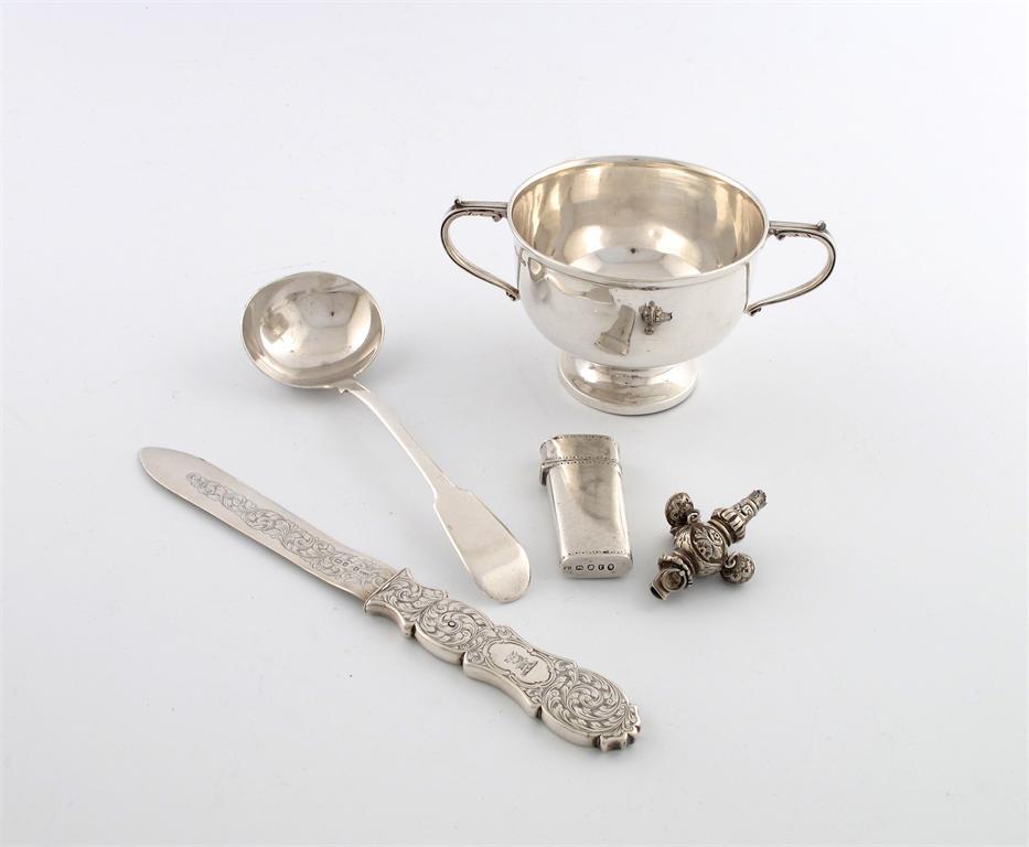 comprising: a Victorian silver paper knife, by Nathaniel Mills, Birmingham 1851, engraved foliate scroll decoration, length 22.1cm, a two handled bowl, a George III lancet case, London 1894, a baby's rattle, a.f, and a sauce ladle, approx. weight 8oz. (5)