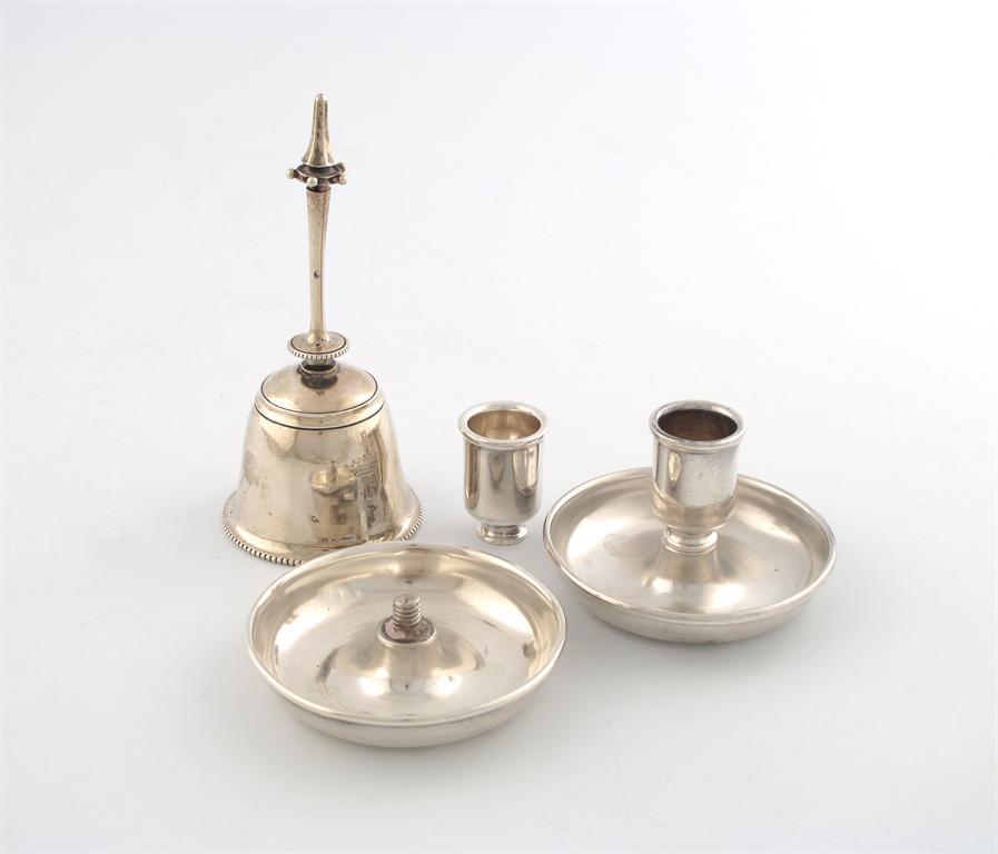 circular form, with two unmarked unassociated capitals, plus a continental silver table bell, with a beaded border and engraved with a crowned 'H', lacking clanger, approx. weight 3.8oz. (5)
