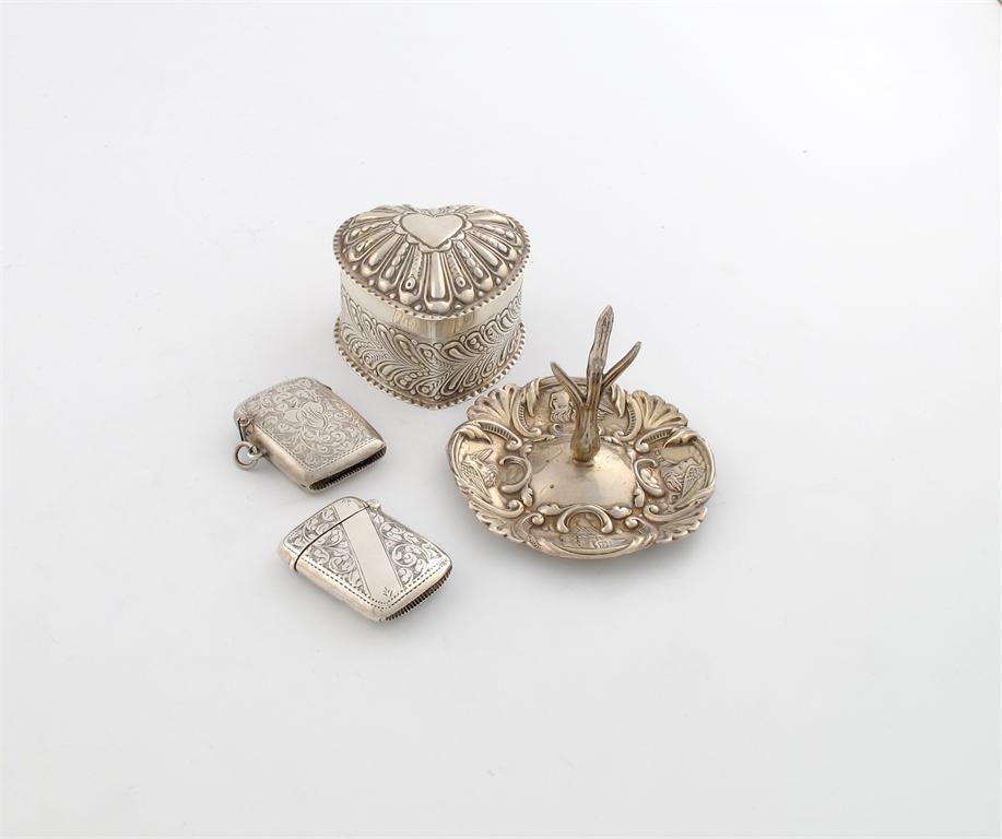 A mixed lot of silver items, comprising: a heart shaped dressing table box, embossed decoration, by William Comyns, London 1892, a silver ring stand, Birmingham 1909, plus two vesta cases, approx. weight 4.5oz. (4)