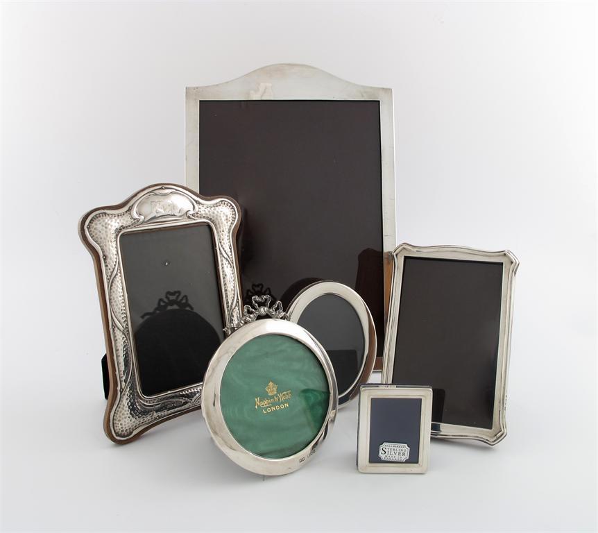 A collection of silver photograph frames, various dates and makers, comprising: a frame of upright arched rectangular form, Birmingham 1927, a frame of shaped upright rectangular form, spot-hammered decoration, Chester 1911, plus four others. (6)
