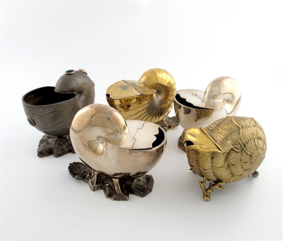 comprising: three of conventional nautilus form, on rocky bases, one gilded, plus one on Britannia metal and inlaid with green hard stones, and one gilded and of shell form, on three coral feet. (5)