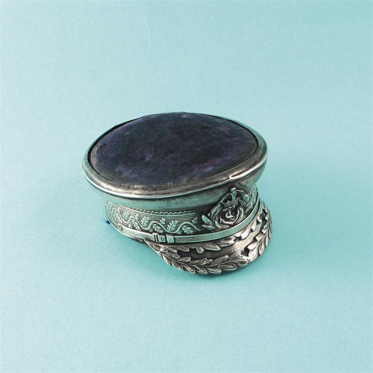 A modern novelty pin cushion, in the form of a naval cap, with registered design number, by S Blackensee & Son, Chester, 1910, 3in (7.5cm).