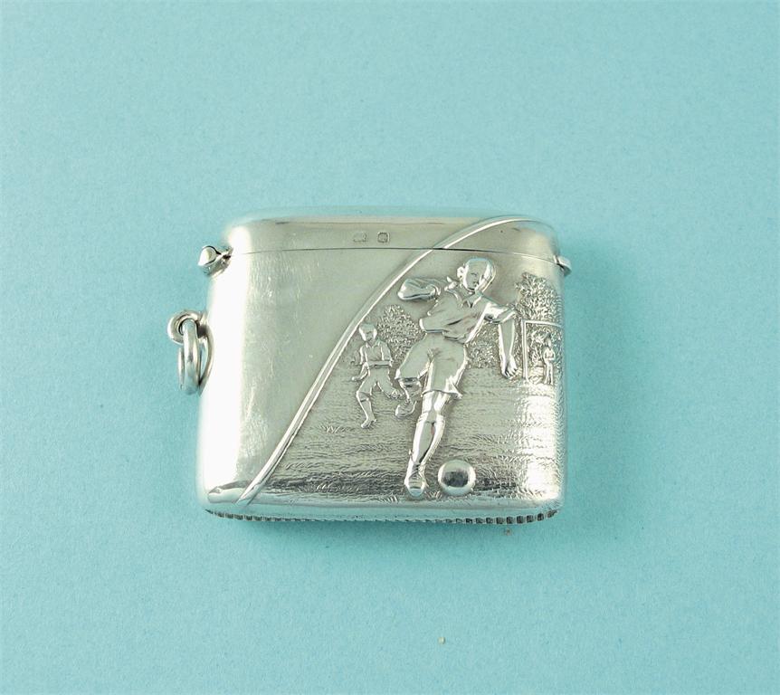 An Edwardian vesta case, stamped with a footballer about to kick a ball, with other players in the distance, by H. Matthew, Birmingham 1908, 2in (5cm), 1oz.