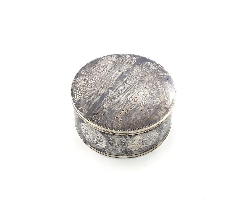 circular form, the pull-off cover with a gentleman and lady within an architectural setting, the side with various panels, gilded interior, diameter 8.3cm, approx. weight 5oz.