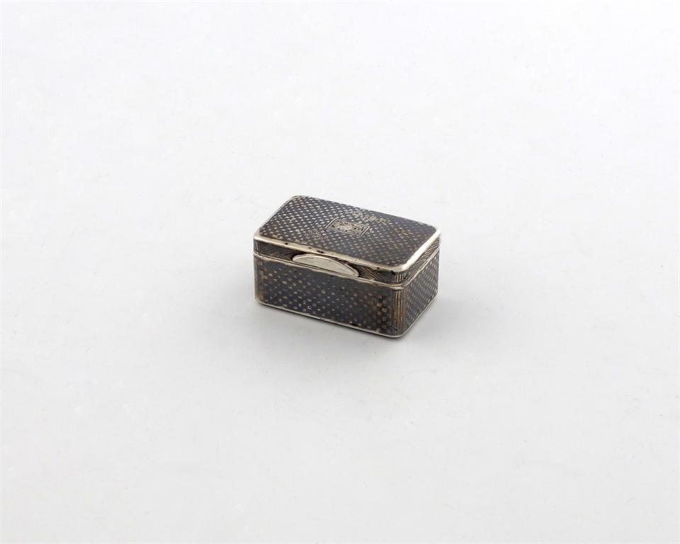 A Russian silver and niello work snuff box, St. Petersburg 1883, rectangular form, with chequer board decoration, gilded interior, length 4.1cm, approx. weight 1oz.