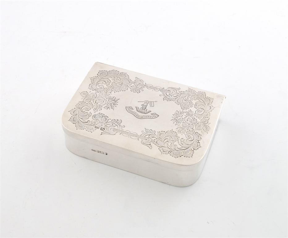 A Victorian silver sandwich box, by Walker and Hall, Sheffield 1891, rounded rectangular form, hinged cover and back, the cover and base with engraved foliate decoration, the centre with a crest and motto, length 13.2cm, approx. weight 12oz.