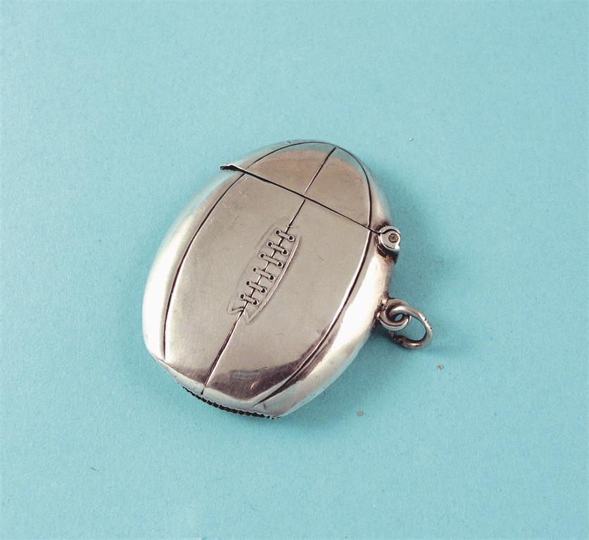 An Edwardian vesta case, in the form of a rugby ball, by W.H.Sparrow, Birmingham 1905, 2in (5cm), 0.5oz.