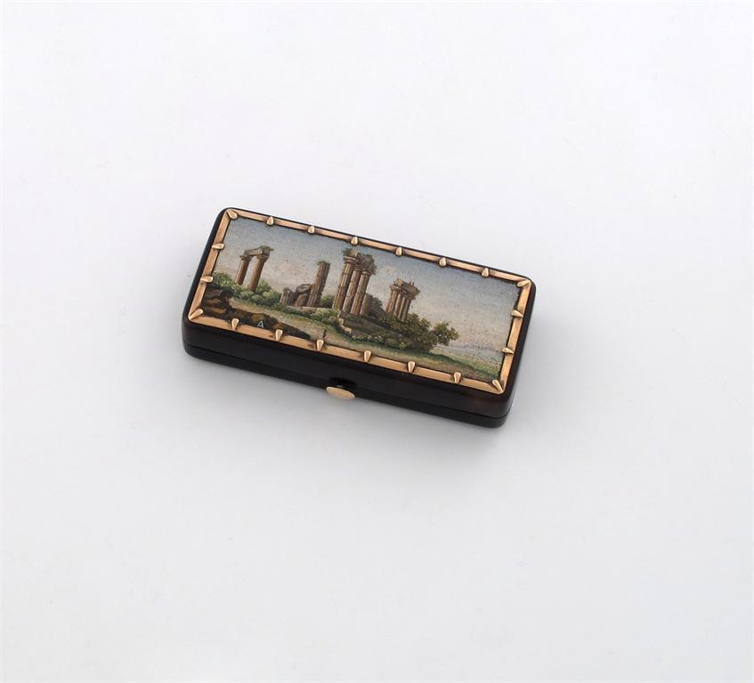 rectangular form, with a scene of classical ruins, gold mounts, the hinged cover opens to reveal a velvet lined interior, length 6.1cm.