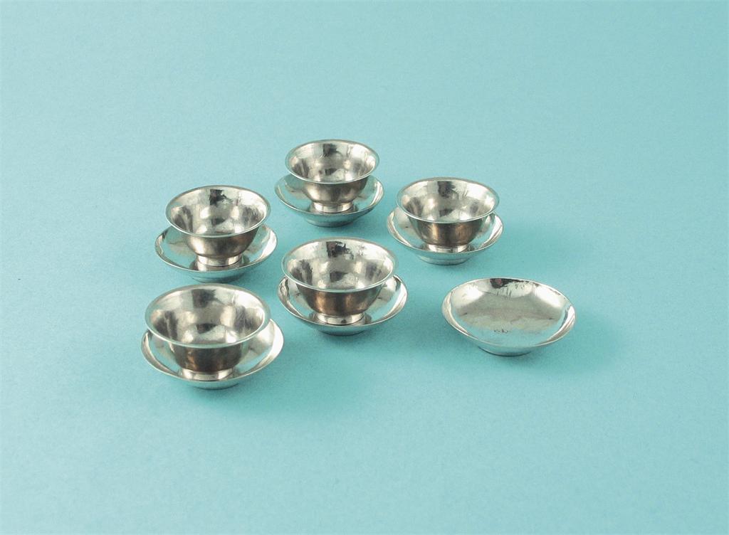 A set of five George I/II miniature or toy tea bowls and six saucers, each piece struck with a makers mark only, by David Clayton, London 1720-30, the saucers 1.1in (2.7cm)diameter (11).