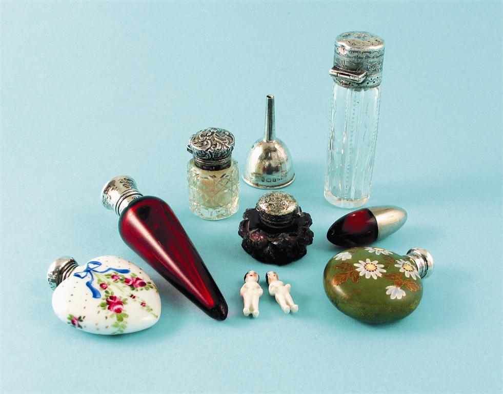 A mixed lot: comprising seven assorted mounted scent flasks/bottles, a perfume funnel, hallmarked Birmingham, 1902, and two miniature prorcelain figures. (10)