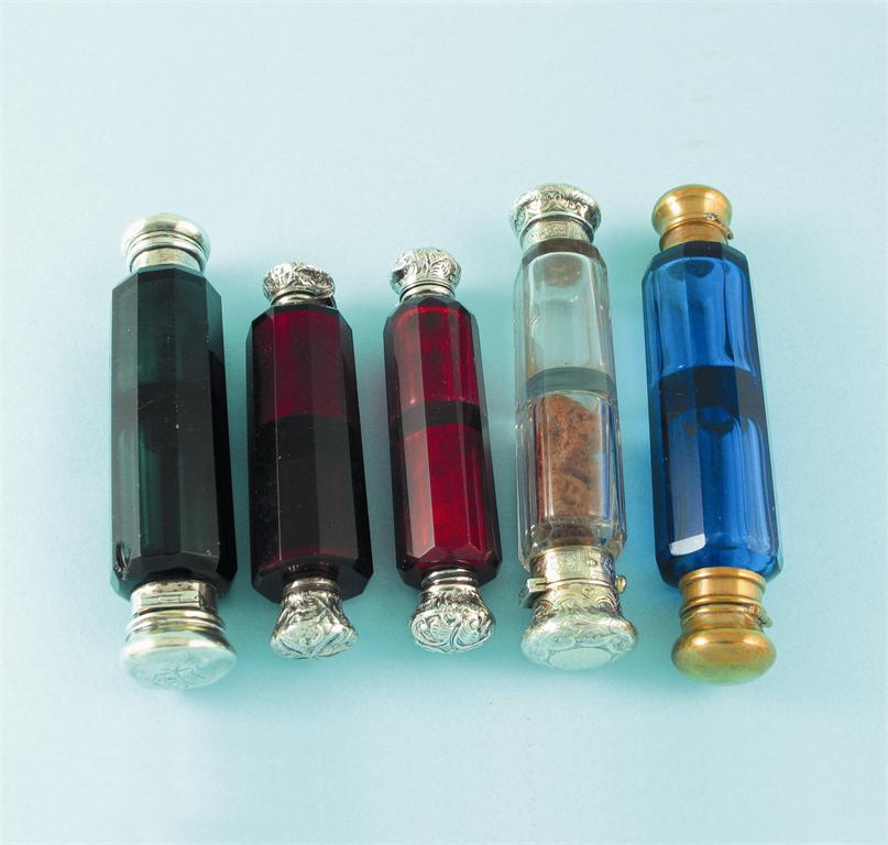 Five Victorian double ended coloured glass scent bottles, (the blue one with plated mounts), (5).