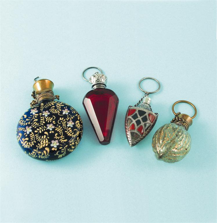 Four small Victorian scents, a Scottish market finger scent set with coloured agates, Birmingham, 1895; a tapering red glass finger scent with a screw cover; a gilt metal mounted glass walnut scent and a brass mounted coloured glass scent flask, (4).
