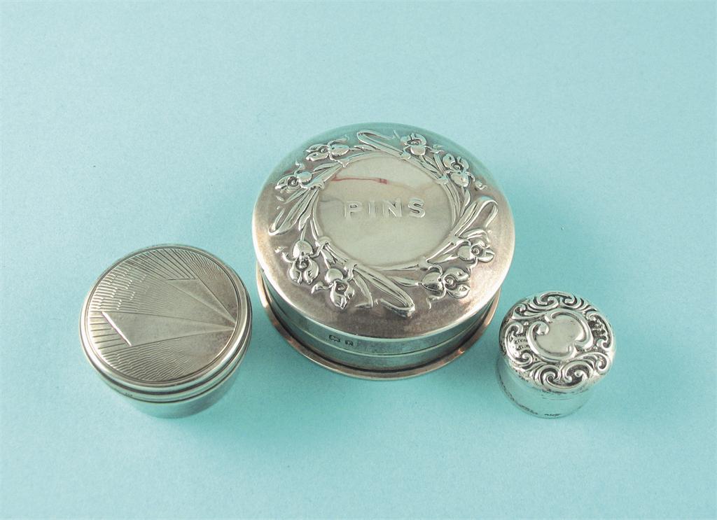 A modern circular pin box and cover, and two other small circular boxes with pull of covers, mixed makers and dates, the pin box 2.25in (6cm) diameter.