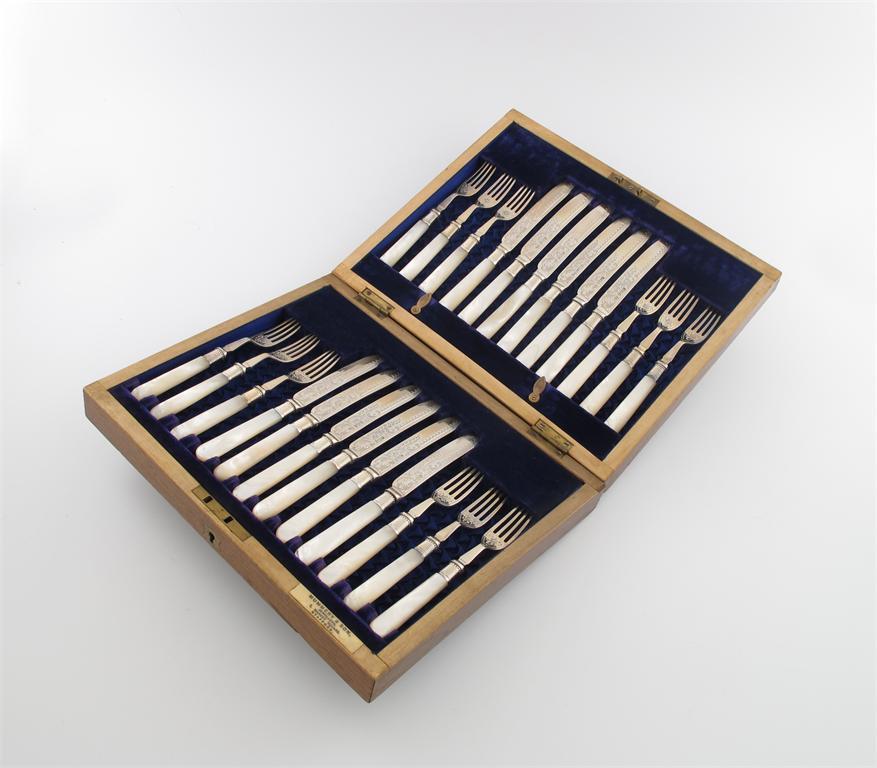 A set of twelve Edwardian silver fruit knives and forks,