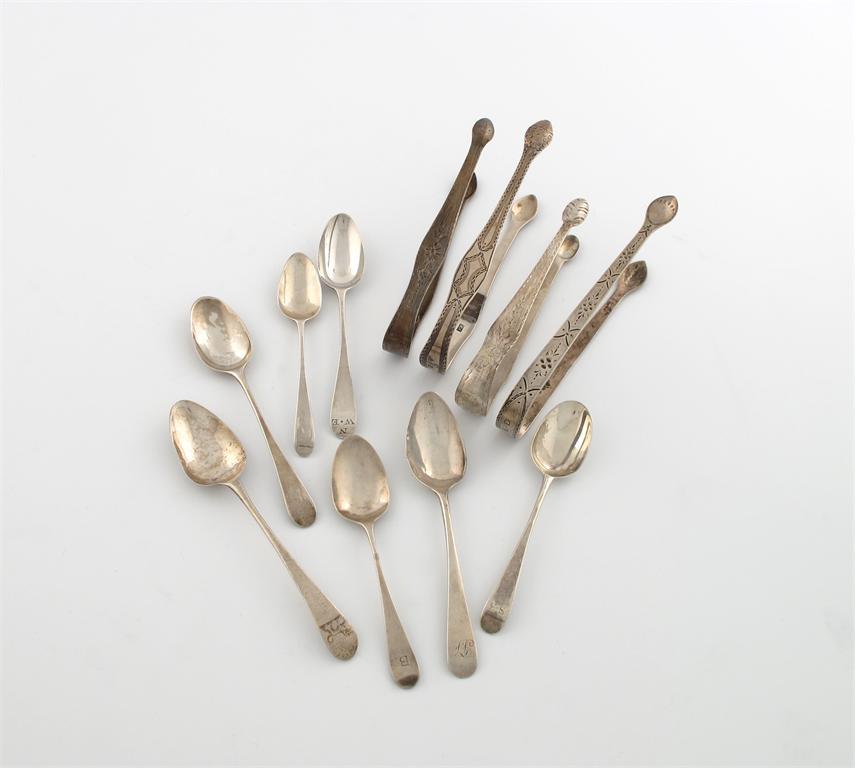 comprising: two pairs of sugar tongs by Hester Bateman, a pair by Peter and Ann Bateman, plus six teaspoons, and a pair of non Bateman sugar tongs and a Scottish teaspoon, approx. weight 6.5oz. (11)