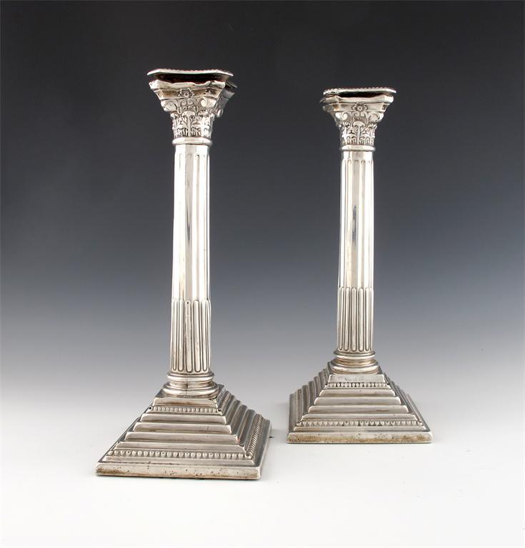 A pair of silver candlesticks, marks worn, Birmingham 1922, Corinthian column form, beaded borders, on a stepped square base, height 30cm. (2)