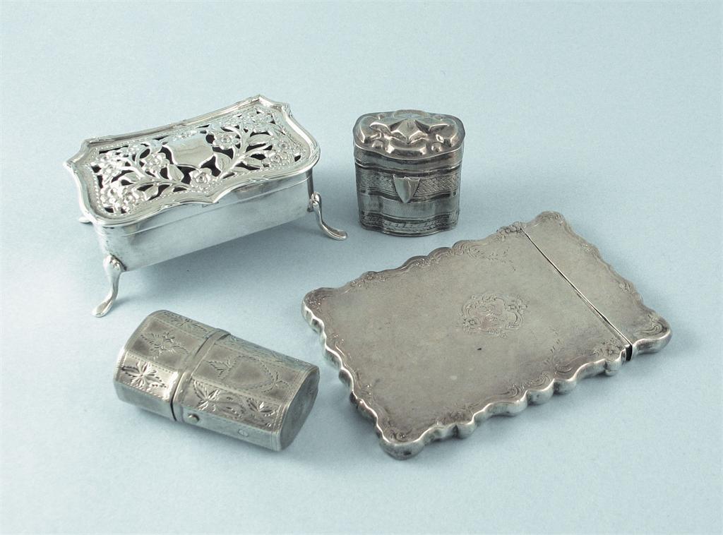 A pot pourri box, a card case, a George III scent bottle case and a Dutch peppermint box, 4.5oz, (4)