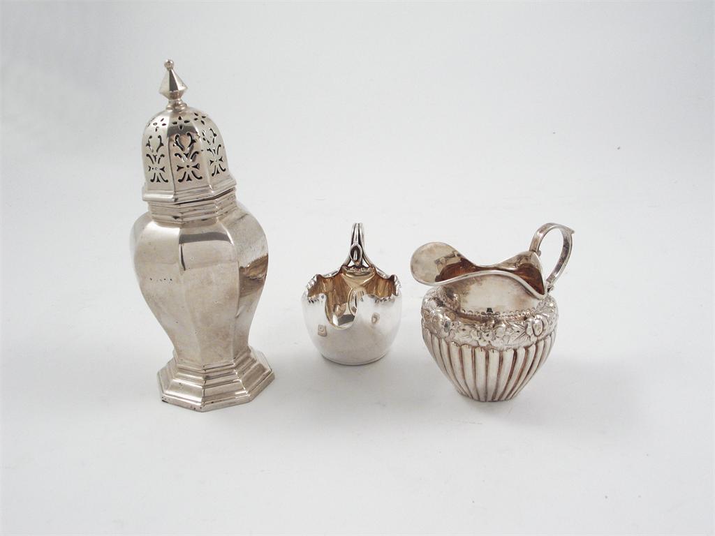 A modern octagonal sugar castor, and two small cream jugs, 6oz, (3).