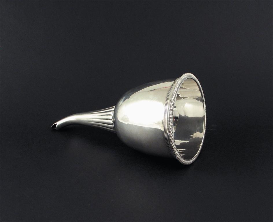 A George III wine funnel, with a deep bowl, a part fluted spout and a detachable strainer section with a gadrooned rim and a plain tang, by William Allen III, London, 1805, 6.7in (17cm), 6oz.