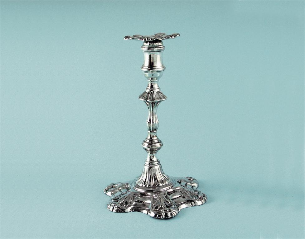 A George II cast taper stick, on a hexafoil base with a knopped column and fluted shell decoration, complete with detachable nozzle, by by Robert Rew, London, 1756, 5.1in (13cm) high, 5.5oz.