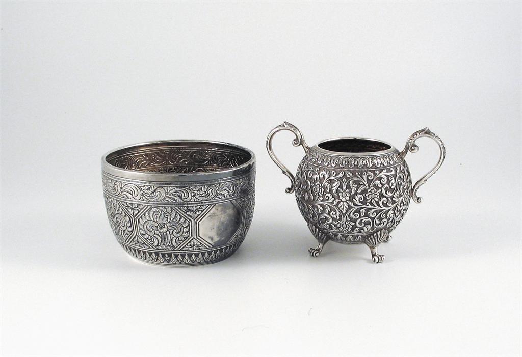 Two curious bowls, an Indian globular sugar bowl, with chased decoration on four feet, English import marks, London 1897, and a Victorian sugar bowl, after an Indian design, with chased decoration, by Stephen Smith, London, 1876, 4.2in (10.2cm), 12oz, (2).
