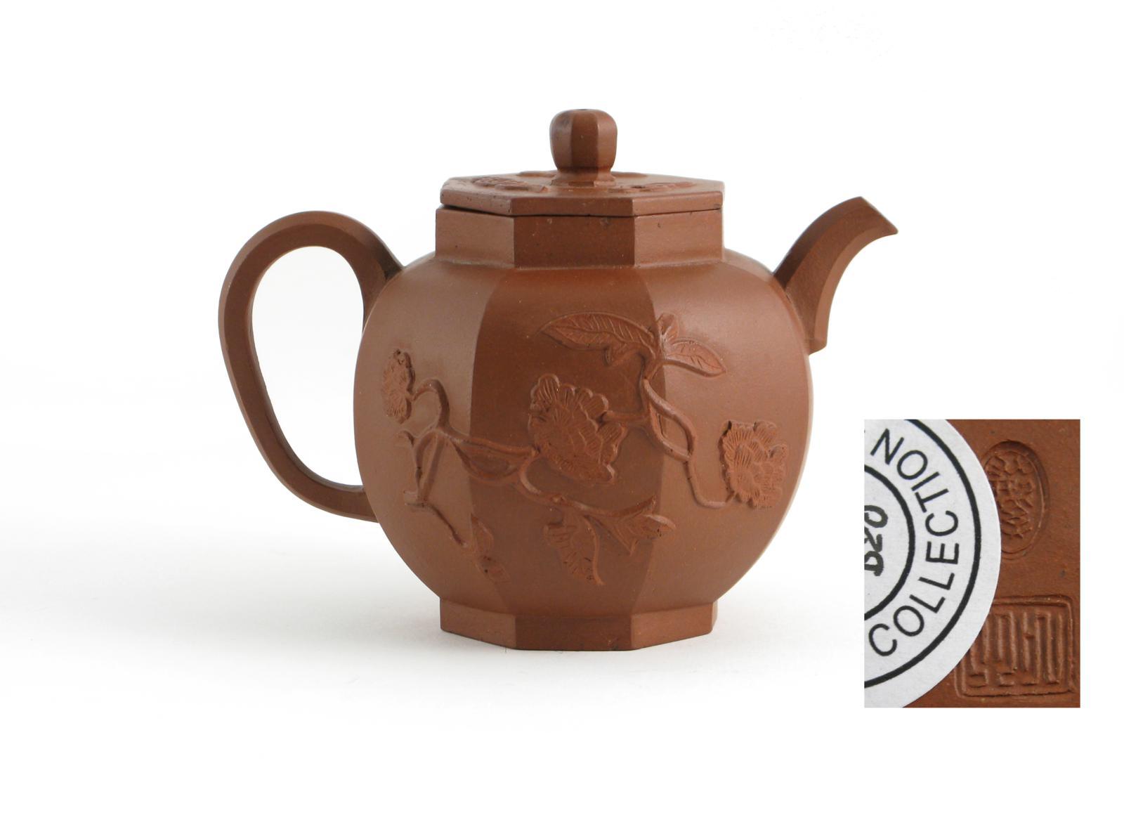A small octagonal Yixing teapot and cover 17th / 18th century, each side applied with a large peony spray, the cover with stylized cloud scrolls, two seal marks to the base, a little restoration to the cover, 11.8cm. (2)