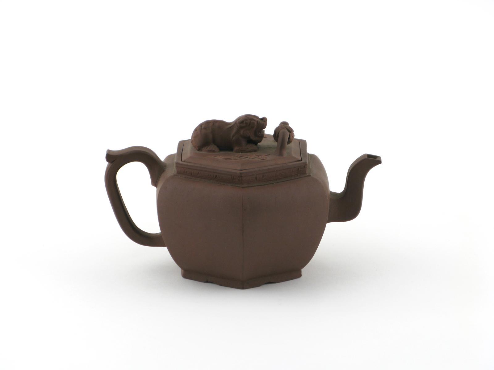 A rare hexagonal Yixing teapot and cover mid 18th century, raised on a shaped footrim, the neck band impressed with a key fret design, the cover surmounted by a recumbent lion dog before a spinning brocade ball, indistinct oval seal mark to the cover, 20.8cm. (2)
