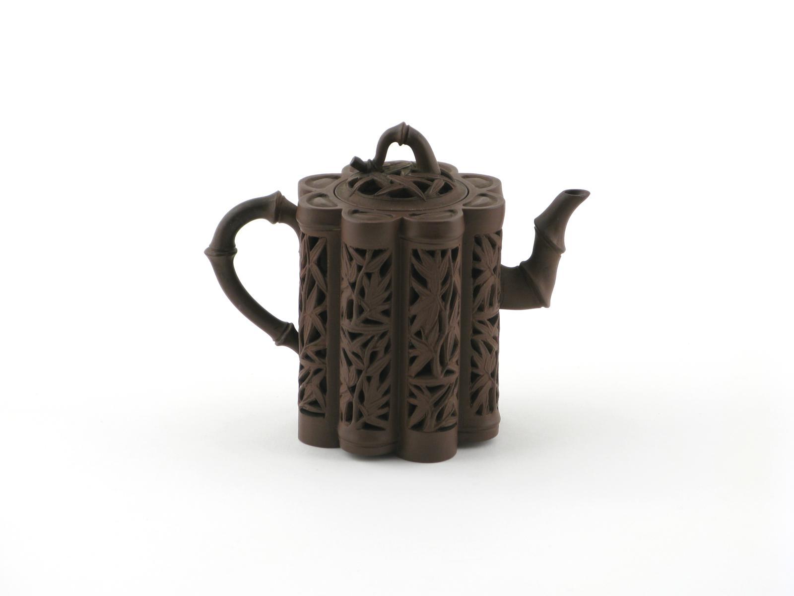 An unusual Yixing octagonal teapot and cover 1st half 18th century, modelled with eight reticulated bamboo poles, pierced with a bamboo design, the handle broken off and well restored, 15cm. (2) Provenance: the Arthur J Harris collection. Cf. K S Lo, The Art of the Yixing Potter, p.145 and Patrice Valfré, Yixing Teapots for Europe, no.268 for a similar example.