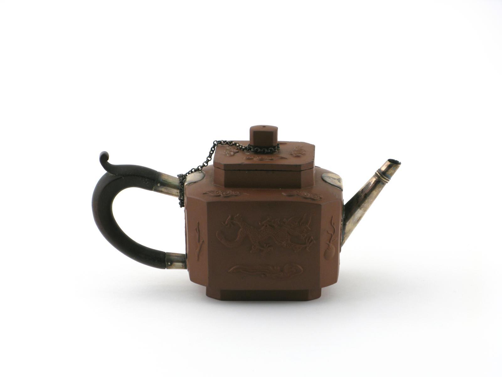 A square-section Yixing teapot and cover late 17th / early 18th century, the body with chamfered corners and applied with dragons chasing flaming pearls amidst ruyi cloud scrolls, replacement spout and handle, 22cm. (2) Provenance: the Arthur J Harris collection. Illustrated: Patrice Valfré, Yixing: Teapots for Europe, no.194.