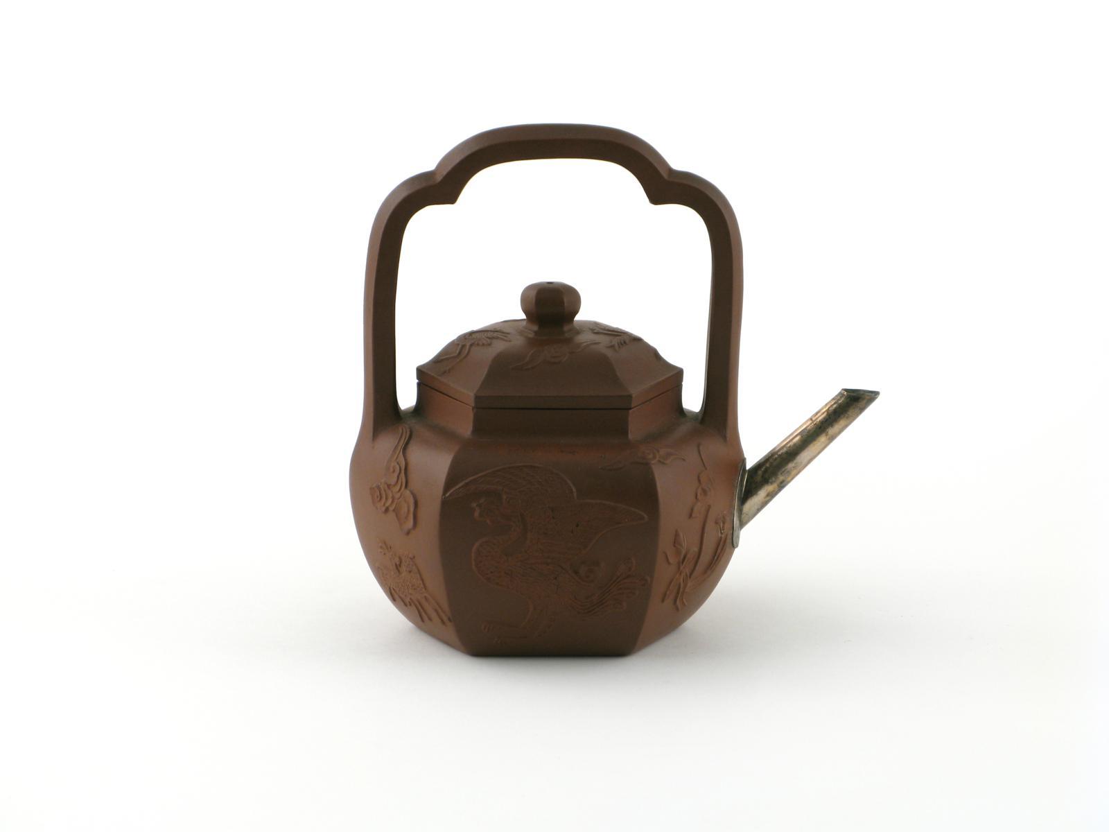 A hexagonal Yixing teapot and cover late 17th / early 18th century, the sides applied with phoenix, deer, lotus and cloud scrolls beneath an overhead handle, replacement metal spout, 17cm. (2) Provenance: the Arthur J Harris collection. Illustrated: Patrice Valfré, Yixing: Teapots for Europe, no.195. Exhibited: Yixing, L'Art de la Theiere Pourpre, Royal Brussels Museum, April - September 2001.