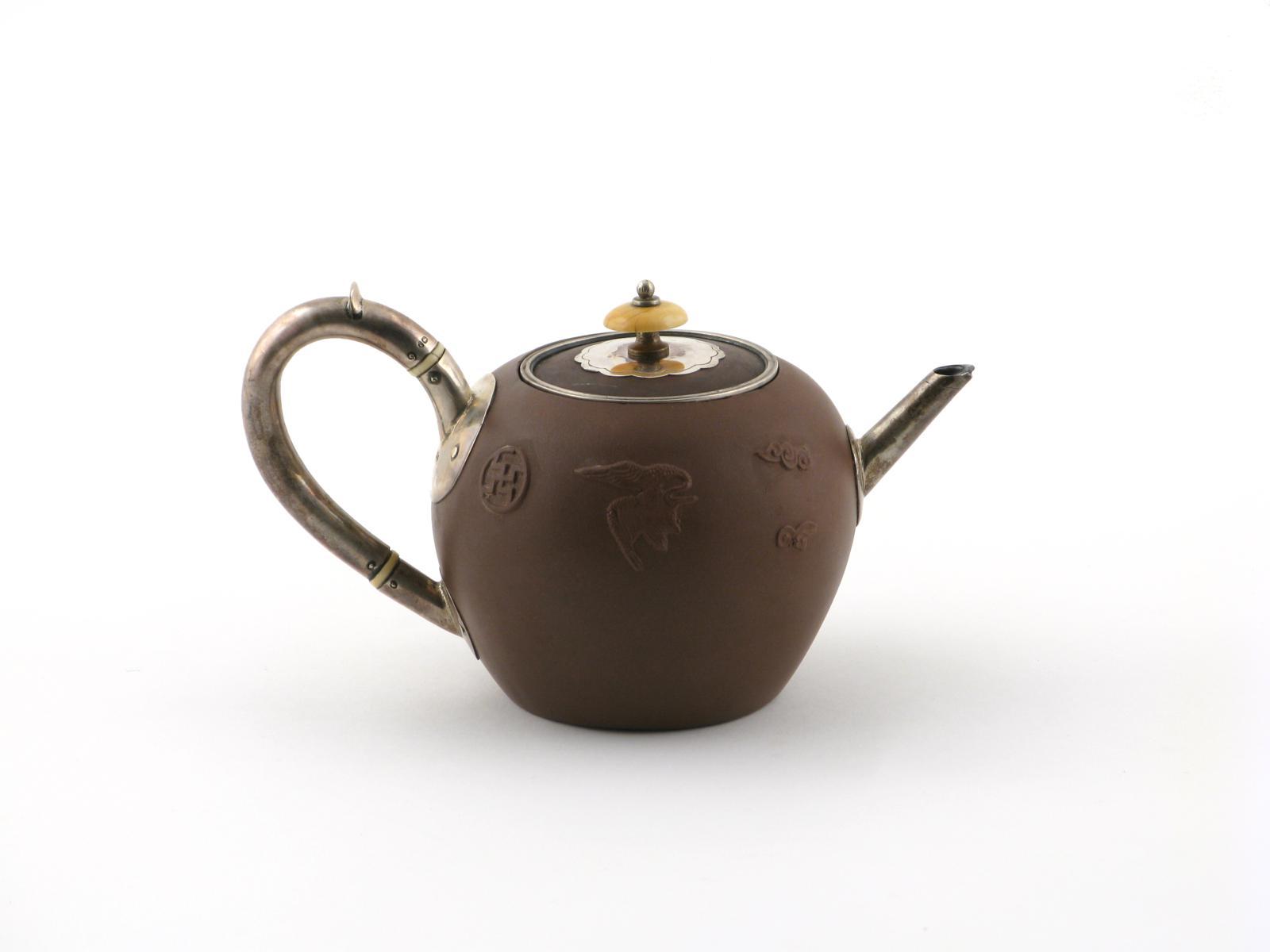 An early Yixing teapot and cover 2nd half 17th century, applied with a lion dog to one side, a bird to the other, replacement silver handle and spout, the cover with silver mounts, 20.5cm. (2) Provenance: the Arthur J Harris collection. Illustrated: Patrice Valfré, Yixing Teapots for Europe, no.18.