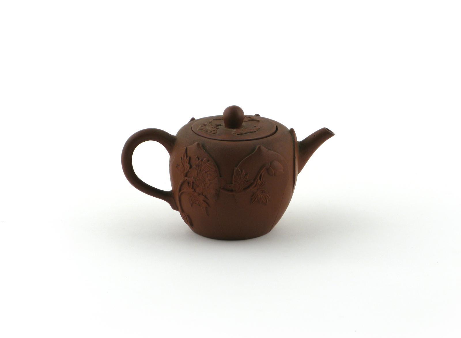 A lotus-moulded Yixing teapot and cover 1st half 18th century, the five petals rising from the foot applied with sprays of peony, the cover applied with auspicious motifs, 14cm. (2) Provenance: the Arthur J Harris collection. Illustrated: Patrice Valfré, Yixing: Teapots for Europe, no.216.