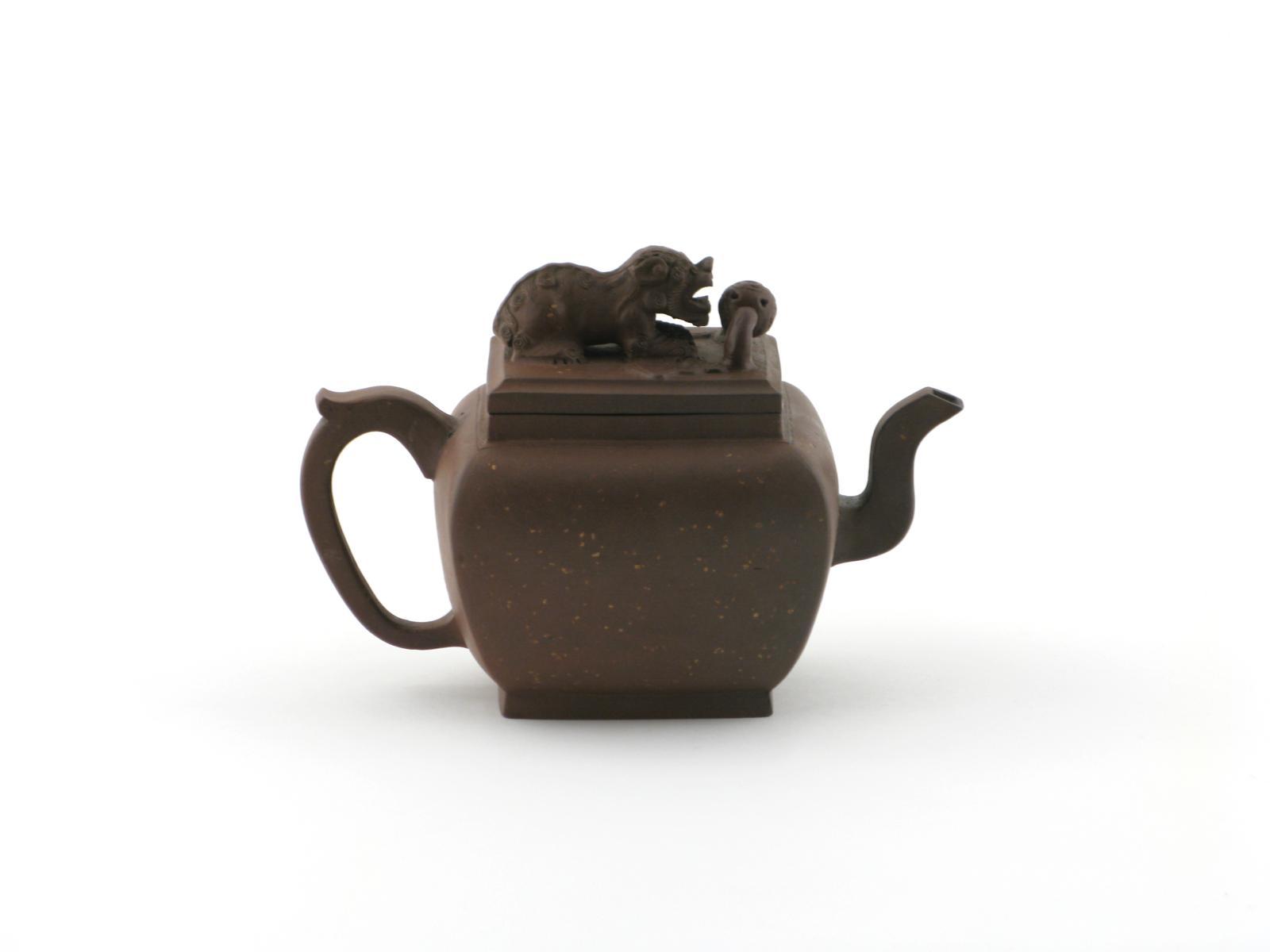 An Yixing teapot and cover mid 18th century, the rectangular section body flecked with white clay, the cover surmounted with a lion dog finial biting into a brocade ball, some restoration to the cover and handle, 20cm. (2)