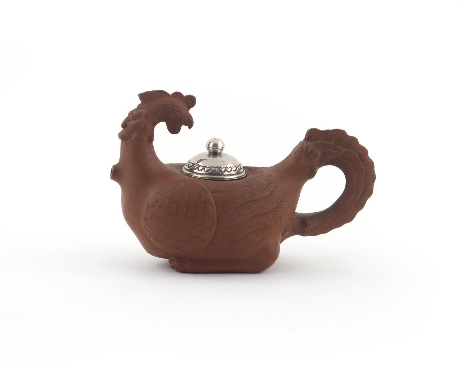 A rare Yixing phoenix teapot and metal cover early 18th century, the bird's head turned over its back, its finely incised tail forming the handle, both legs tucked beneath the body, the cover a metal replacement, a small chip to the coxcomb, 15.8cm. (2)