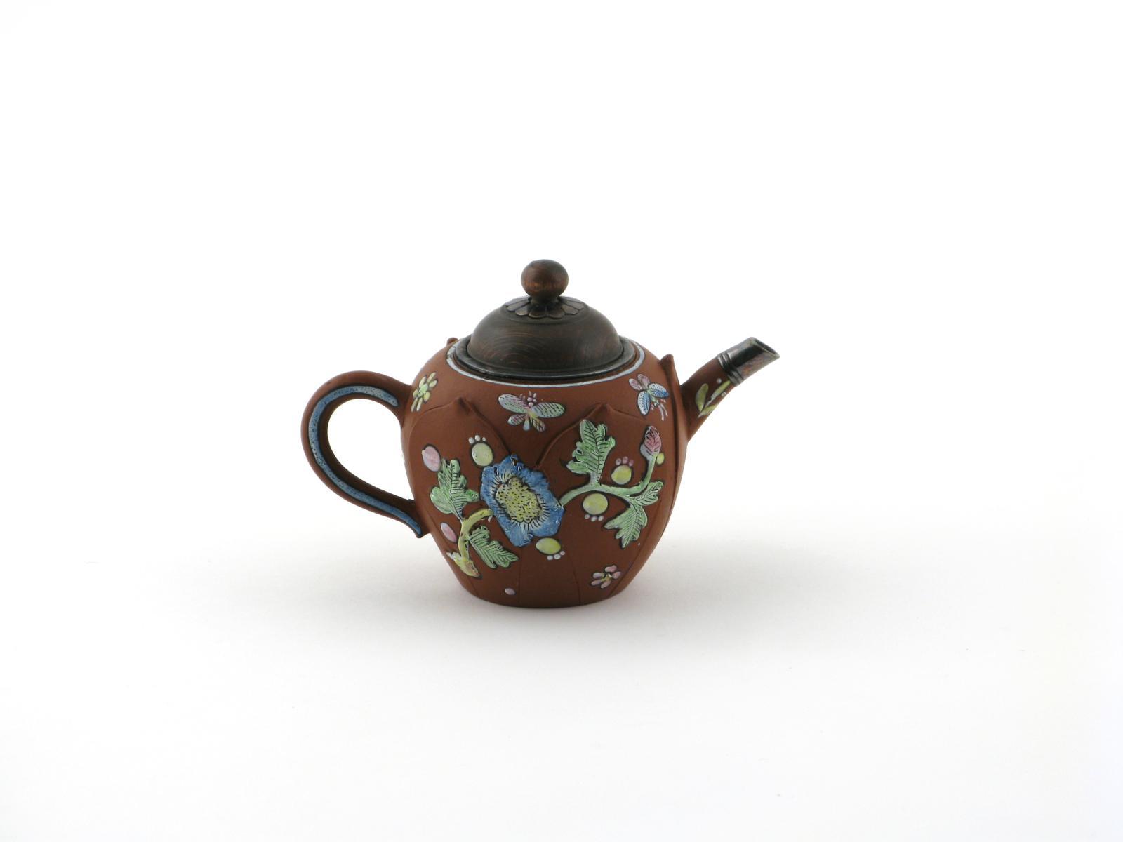 A small lotus-moulded Yixing teapot and wooden cover early 18th century, applied and enamelled in Europe with peony and butterflies, replacement cover, the spout metal-capped, 15cm. (2) Provenance: the Arthur J Harris collection. Illustrated: Patrice Valfré, Yixing Teapots for Europe, no.317. Exhibited: Yixing, L'Art de la Theiere Pourpre, Royal Brussels Museum, April - September 2001.