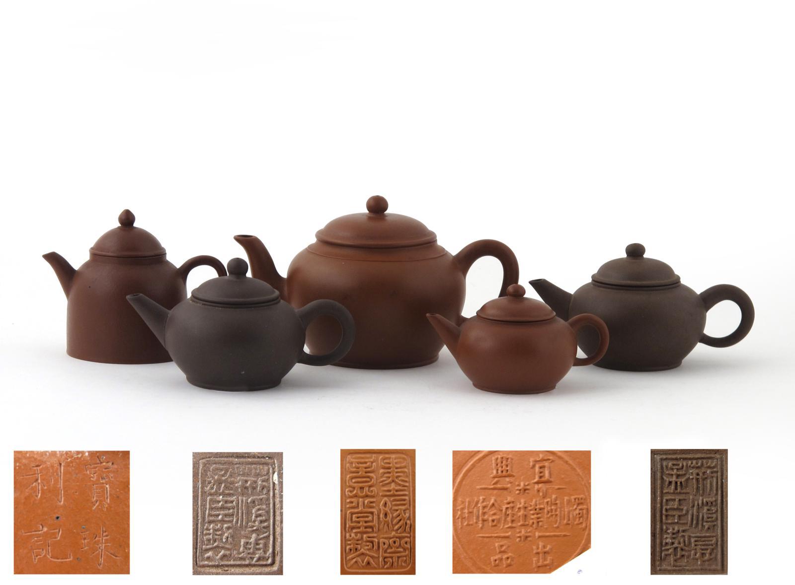 Five small Yixing teapots and covers 20th century, four globular and one bell-shaped, various impressed and incised marks, 15.5cm max. (10) Provenance: the Arthur J Harris collection.