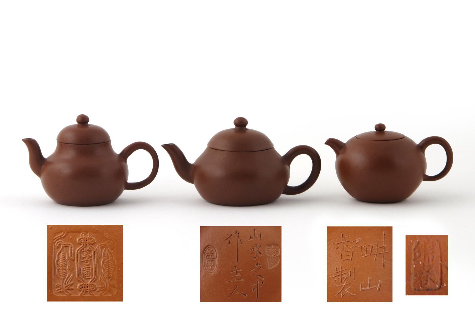 Three miniature Yixing teapots and covers 19th century, two pear-shaped, one globular, various impressed and incised marks, 11.5cm max. (6)