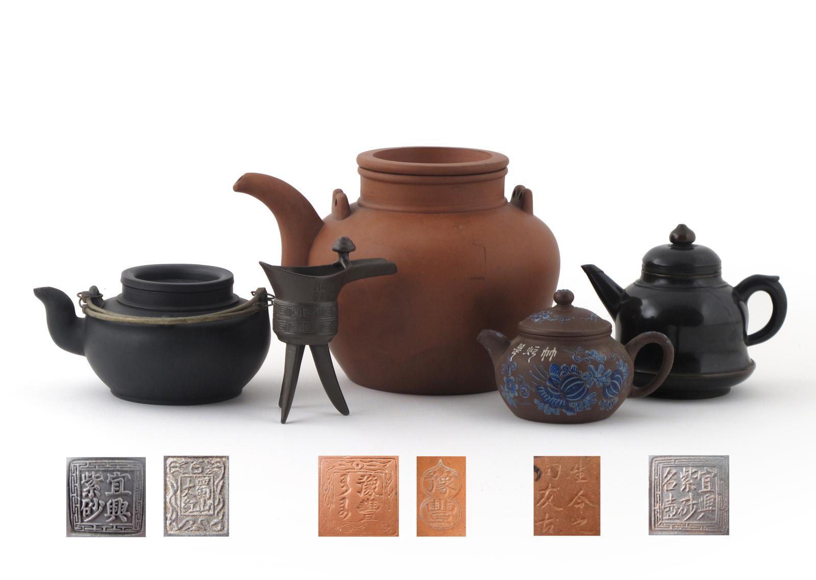 Four Yixing teapots and covers 19th / 20th century, one polished for the Thai market, one enamelled with blue flowers and white calligraphy, the others plain bodied with vertical handles, and an Yixing tripod libation cup, various impressed and incised marks, 25cm max. (9)