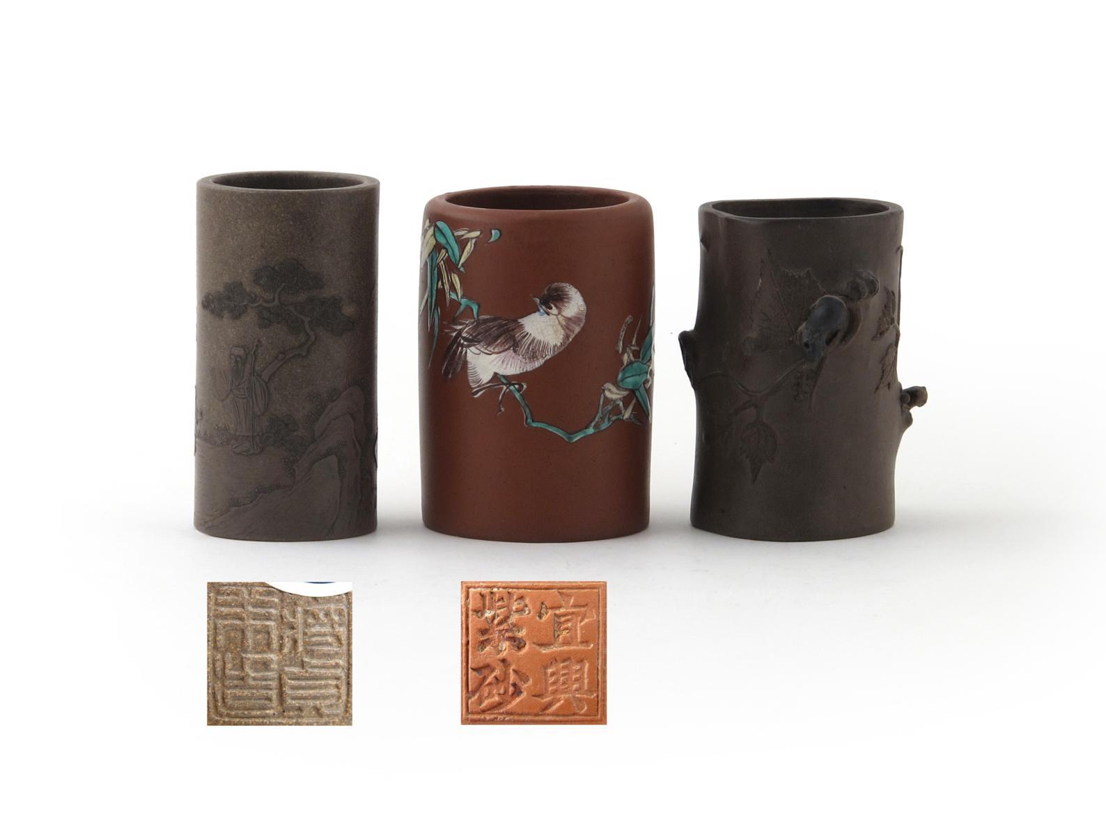 Three Yixing brushpots 18th / 19th century, one modelled as a tree trunk and applied with squirrels and leaves, one decorateds with Shoulao beneath a pine tree, the third enamelled with a bird perched on bamboo, the reverse with calligraphy, seal marks to two, 11.1cm max. (3)