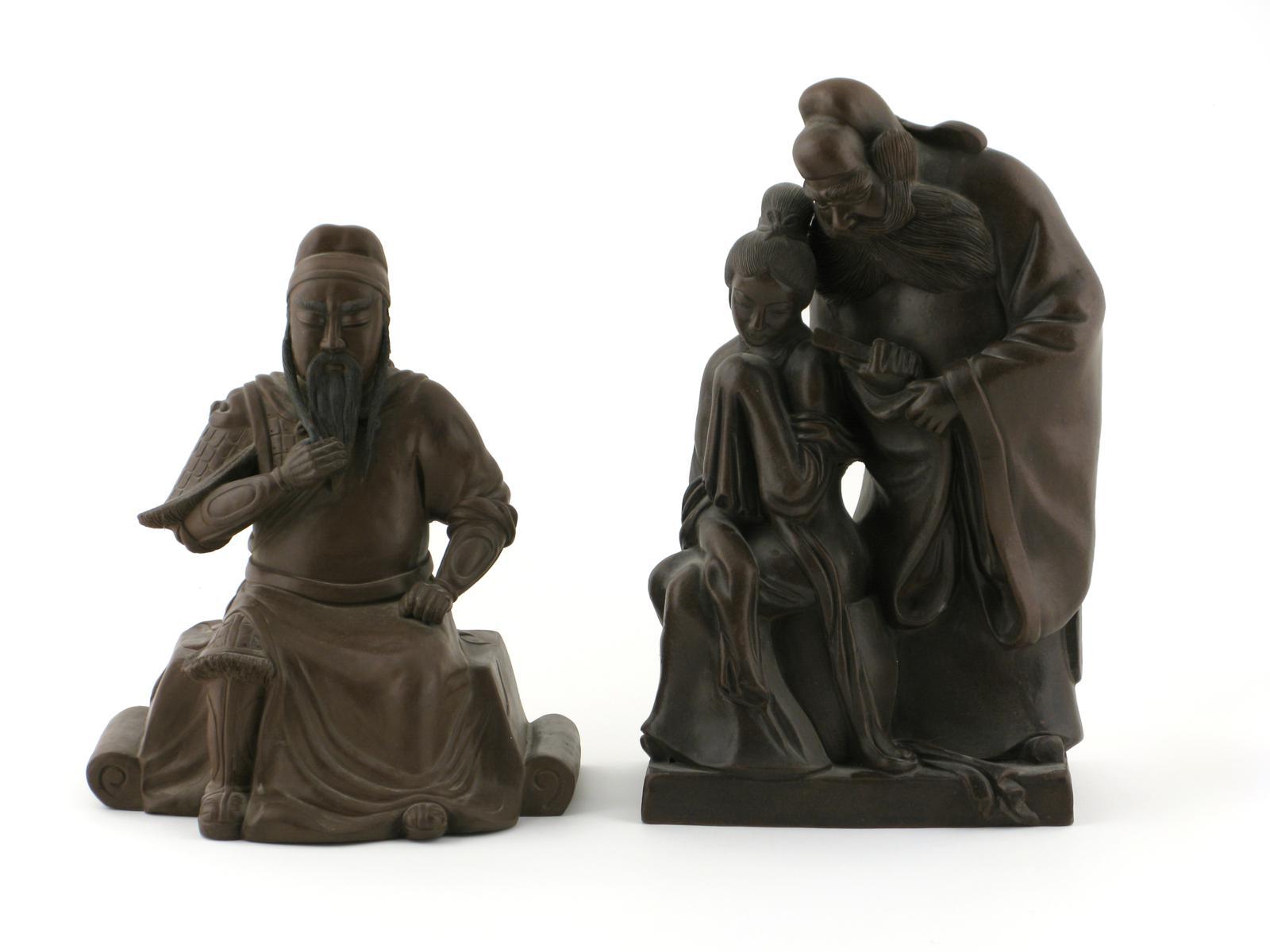Two large Yixing figures 20th century, one of a seated warrior with a long black beard, the other of a young demure maiden and a large bearded gentleman, an indistinct seal mark to one side of the former, 40cm. (2)